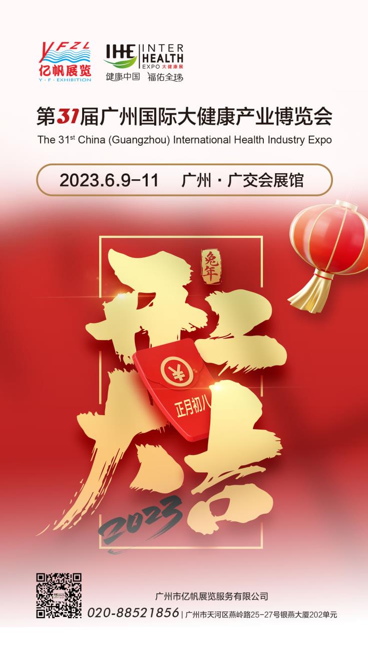 2023年6月9-11日,第31屆廣州國際大健康產業博覽會將展盛大回歸,地點仍然是廣州·廣交會展館。涵蓋健康營養食品、生態農產品 、婦幼健康 、中醫藥及養生產品、腸道健康、智慧養老、抗衰美容/健康養生產品、進口健康食品及用品、大健康產業園區/基地、保健品包裝及生產設備等,全球商機,一展觸達。