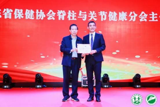 創(chuàng)會會長張壽生為魏富鑫教授頒發(fā)廣東省保健協(xié)會脊柱與關節(jié)健康分會主任委員聘書