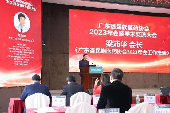 廣東省民族醫藥協會會長梁沛華作2023年度工作報告。梁會長用今年6項工作,來年6大任務概括了年會報告的大綱。