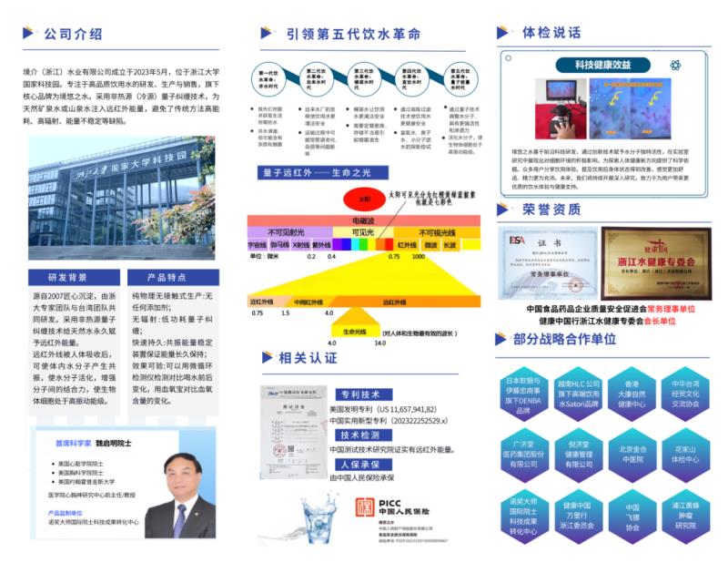 境介(浙江)水業有限公司成立于2023年5月,位于浙江大學國家科技園。專注于高品質飲用水的研發、生產與銷售,旗下核心品牌為境悠之水。采用非熱源(冷源)量子糾纏技術,為天然礦泉水或山泉水注入遠紅外能量,避免了傳統方法高能耗、高輻射、能量不穩定等缺陷。