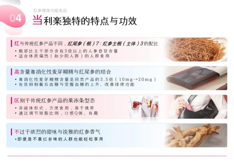 當利楽將多種功能融于一條紅參果凍棒中,可謂“小身材,大作為”。每條果凍棒蘊含經官方認證的八大保健功效,包括抑制餐后血糖上升、改善血中中性脂肪(甘油三酯)、促進腸道排便、增強免疫力、緩解疲勞、改善血液循環、抗氧化等。一款產品即可同時管理血糖和免疫,兩方面功能兼顧,非常適合現代人健康管理的需求。