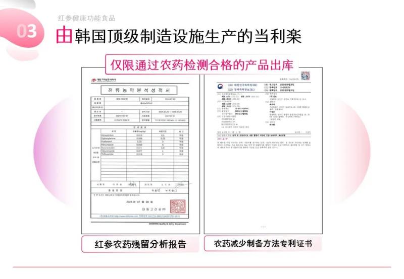作為一款正式的健康功能食品,當利楽已經通過韓國食品醫藥品安全處的功效與安全認證。產品由韓國知名保健品生產企業按照GMP(優秀藥品生產規范)和HACCP食品安全管理標準生產制造,品質上乘可靠。每批產品均經過多重檢驗,符合多項國際?國內質量標準。