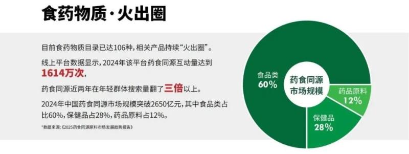 前食藥物質(zhì)目錄已達(dá)106種,相關(guān)產(chǎn)品持續(xù)“火出圈”。其中,線上平臺(tái)數(shù)據(jù)顯示,2024年某主流社交平臺(tái)藥食同源互動(dòng)量超過1614萬(wàn)次,藥食同源近兩年在年輕群體搜索量翻了三倍以上。