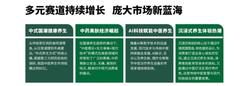 食藥物質(zhì)的火爆是現(xiàn)今大眾重視自身健康養(yǎng)生的直接體現(xiàn)。在食藥物質(zhì)火出圈的引領(lǐng)下,中式國(guó)潮健康養(yǎng)生、中藥美膚、AI中醫(yī)養(yǎng)生、沉浸式養(yǎng)生體驗(yàn)等細(xì)分賽道精準(zhǔn)切中現(xiàn)代消費(fèi)者的痛點(diǎn),市場(chǎng)賽道持續(xù)拓寬和增長(zhǎng)。