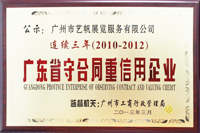 藝帆展覽連續三年榮獲“廣東省守合同重信用企業”榮譽稱號