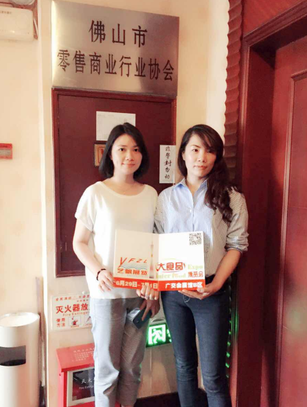 圖為:藝帆展覽專(zhuān)業(yè)觀眾組織部彭部長(zhǎng)(右一)與佛山市零售商業(yè)行業(yè)協(xié)會(huì)陳有珍副秘書(shū)長(zhǎng)(左一)合影