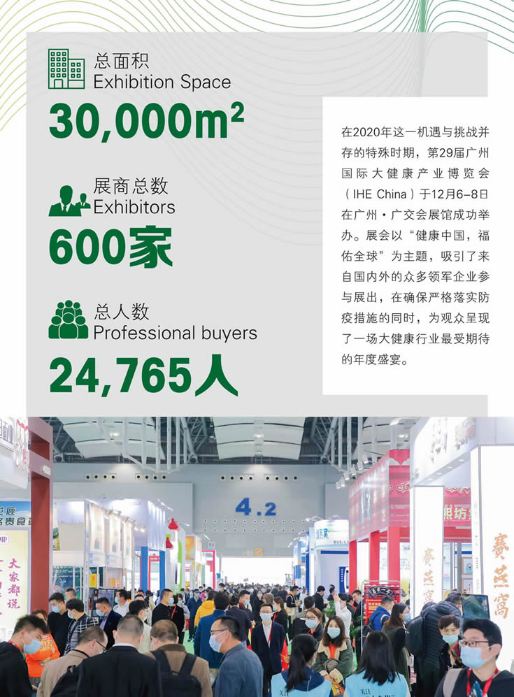 在2020年這一機遇與挑戰并存的特殊時期,第29屆廣州國際大健康產業博覽會(IHE China)于12月6-8日在廣州·廣交會展館成功舉辦。展會以“健康中國,福佑全球”為主題,吸引了來自國內外眾多領軍企業參與展出,在確保嚴格落實防疫措施的同時,為觀眾呈現了一場大健康行業最受期待的年度盛宴。