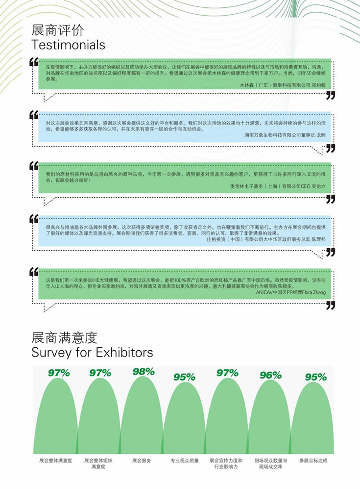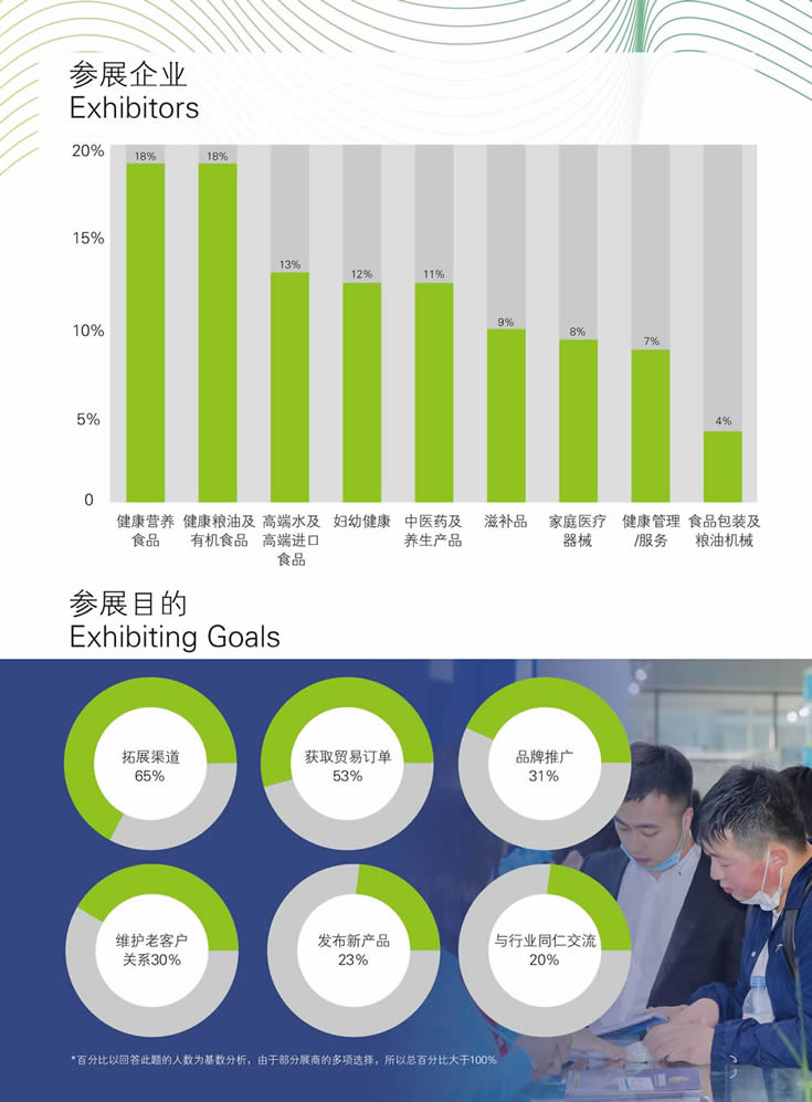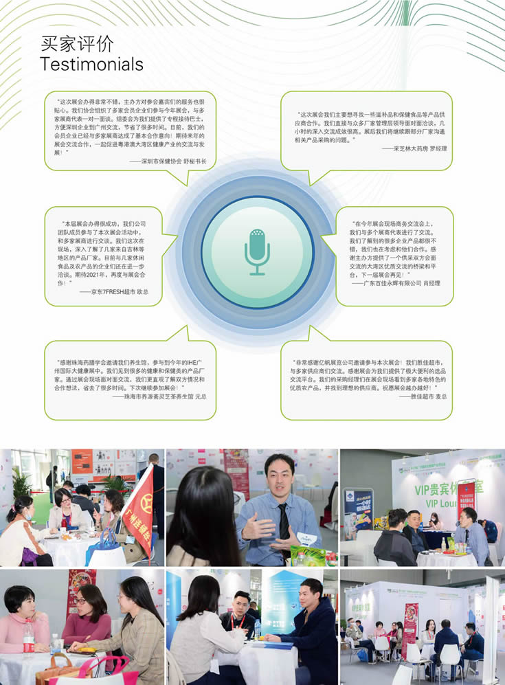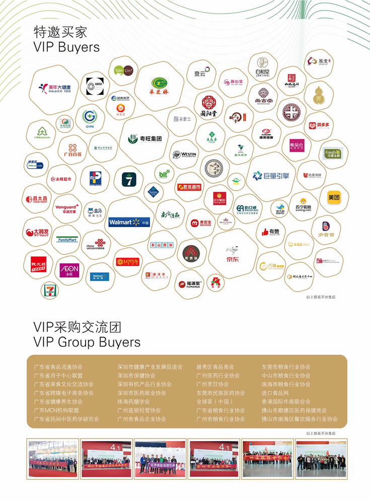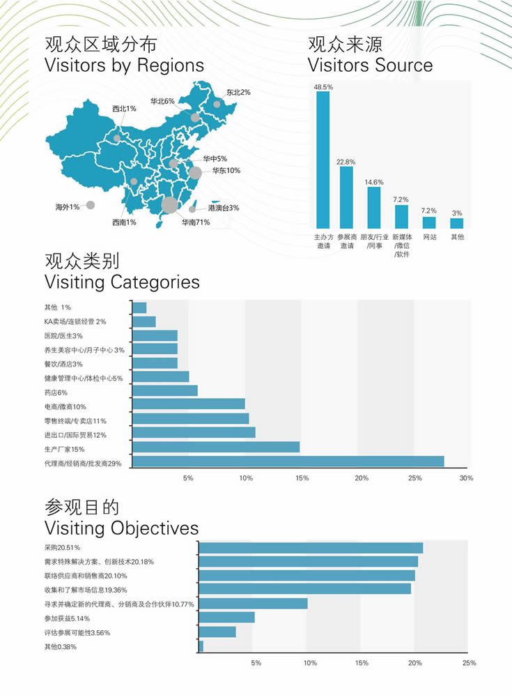 展會吸引了來自海內外專業觀眾、VIP買家20,000余人,其中展會特邀買家500余家, 買家的產業類別覆蓋了代理商/經銷商/批發商、生產廠家、進出口/國際貿易、零售終端/專賣店、電商/微商、藥店、健康管理中心/體檢中心、餐飲/酒店、養生美容中心/月子中心、醫院/醫生、連鎖經營等板塊。