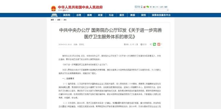 昨日,中共中央辦公廳、國務(wù)院辦公廳最新發(fā)布了《關(guān)于進一步完善醫(yī)療衛(wèi)生服務(wù)體系的意見》?!兑庖姟窂摹皟?yōu)化資源配置,加強人才隊伍建設(shè),推進能力現(xiàn)代化”、“加強分工合作,促進分級診療,推進體系整合化”、“提高服務(wù)質(zhì)量、改善服務(wù)體驗,推進服務(wù)優(yōu)質(zhì)化”、“加強科學(xué)管理、壓實責(zé)任、推進管理精細化”、“深化體制機制改革,提升動力,推進治理科學(xué)化”五大方面全面闡述建設(shè)中國特色優(yōu)質(zhì)高效的醫(yī)療衛(wèi)生服務(wù)體系的政策措施。