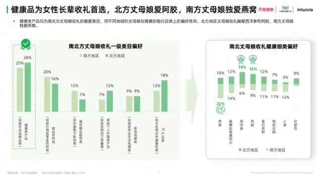 除了性別心智差異外,南北贈禮地域差異也是相當(dāng)明顯?!栋灼分赋鼋】灯肥桥蚤L輩收禮首選,但北方丈母娘偏愛西洋參、阿膠和蛋白質(zhì)粉,南方丈母娘則獨愛燕窩、氨糖軟骨素和人參。