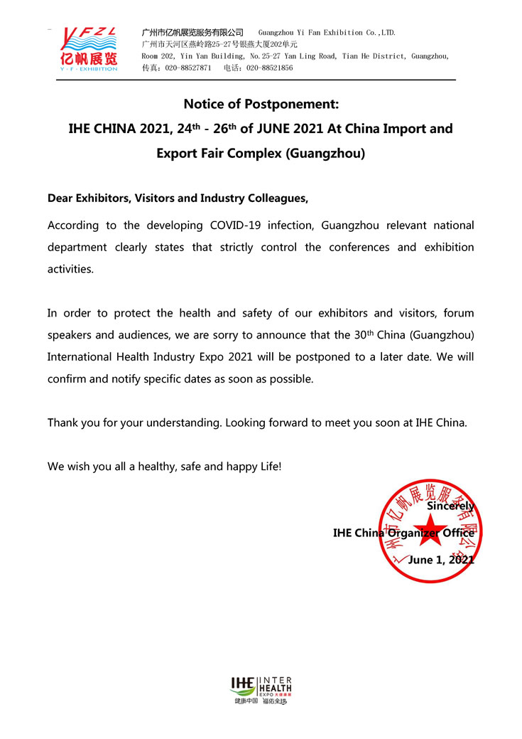 Notice of Postponement: IHE CHINA 2021, 24th - 26th of JUNE 2021 At China Import and Export Fair Complex (Guangzhou)